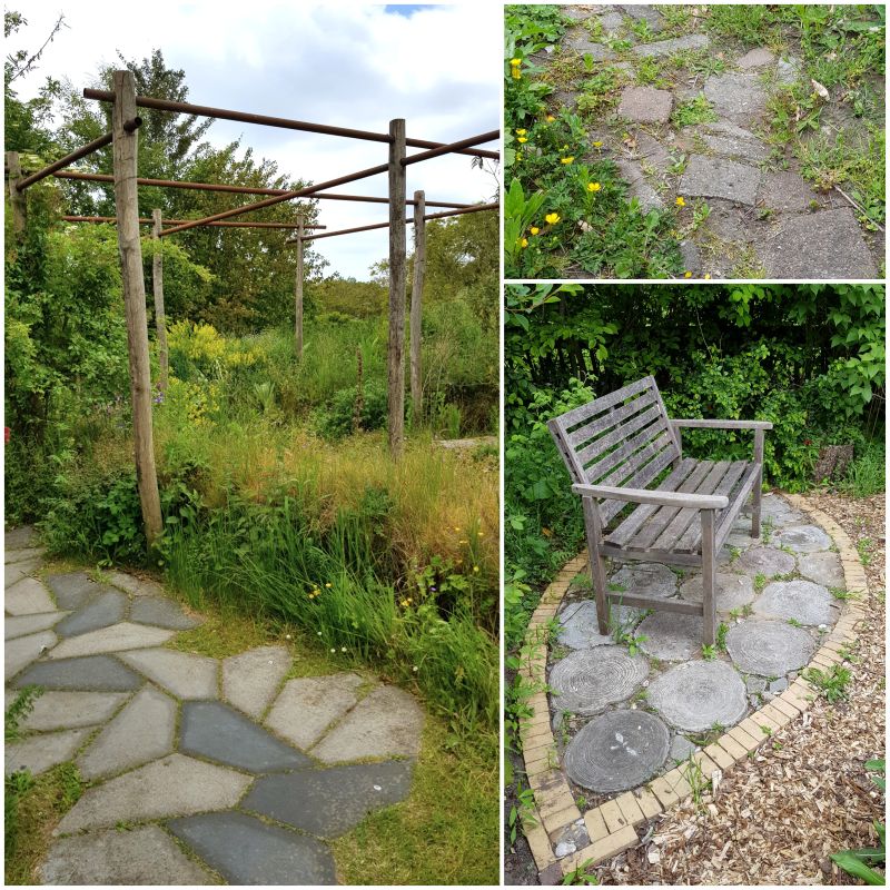 Het linkerpad vanaf het terras is van gras, en dat leidt naar een hoekje achterin waar een eenpersoonszitje is op een plek waar je ’s avonds nog nét wat zon pakt. Het rechterpad is aangelegd met de kiezels die op het voormalige garagedak lagen. Dat leidt naar een klein zithoekje waar je juist heerlijk in de schaduw kunt vertoeven als het heet is.
