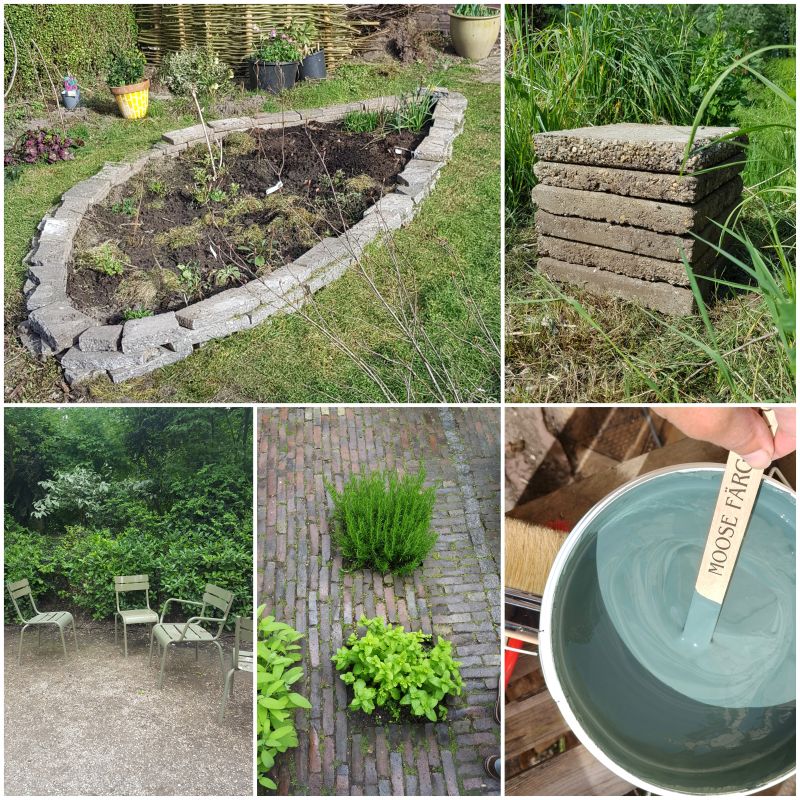 Omdat ikzelf van het hergebruik ben, voor zowel mijn portemonnee als het milieu gunstig, bestaat mijn ‘herhaalmateriaal’ uit stoeptegels en bakstenen van o.a. het oorspronkelijk veel grotere terras en de oprit. Ik smijt ze in tweeën of drieën en stapel er muurtjes van in eenzelfde wat rommelige stijl. Je kunt dat materiaal overigens ook heel strak toepassen, al naar gelang je smaak. Gebruik dan een stoeptegelsnijder.