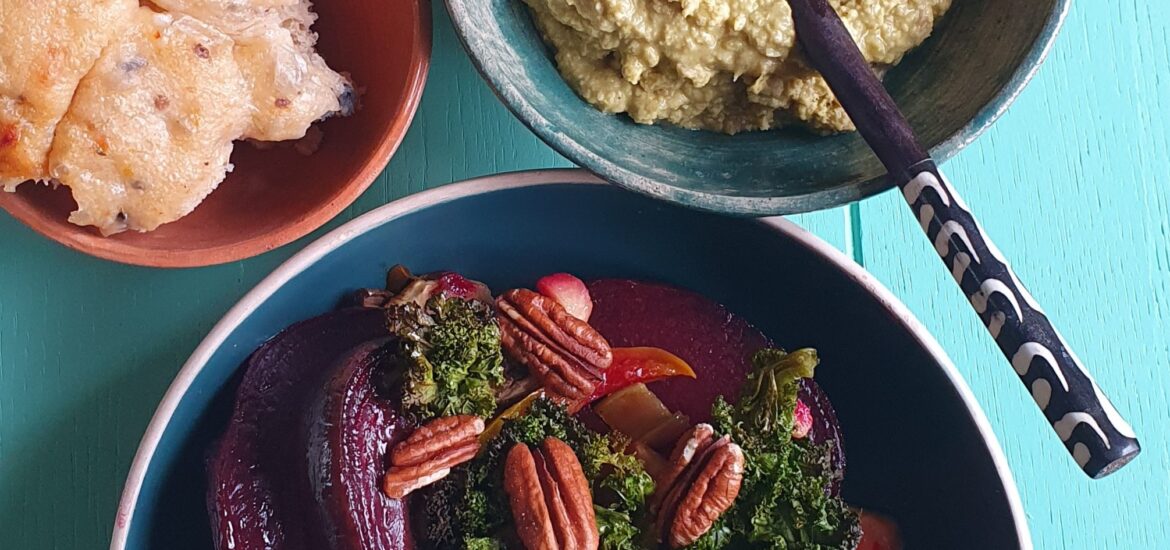 Brabantse adressen: biet en boerenkool besteld bij Goei Eete uit regio Tilburg, focaccia van de Vegan Bakker in Heusden.